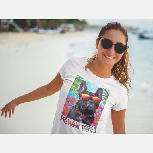 French Bulldog Unisex T-shirt (Hawaii) - Colour: White