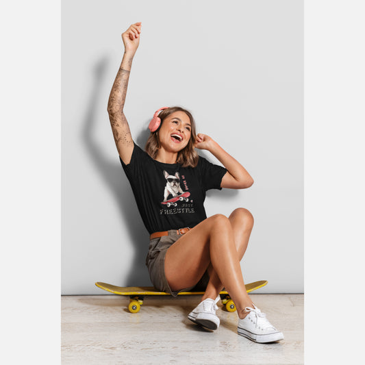 French Bulldog Unisex T-shirt (Skateboard) - Colour: Black