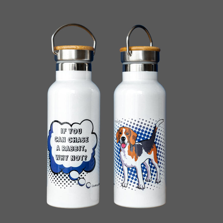 Our Beagle water bottle is your first line of defence against thirst and heat-stroke on a hot summer walk. Half a litre (1.06pints), made of stainless steel with a bamboo screw. Hand-wash and dry before first use. Always clean it with warm water and mild detergents to protect the clean steel inside and the fun dog art on the exterior. Avoid cleaning in a dishwasher, and do not use detergents that contain bleach or chlorine. Not suitable for fizzy, alcohol, and diary-based beverages.