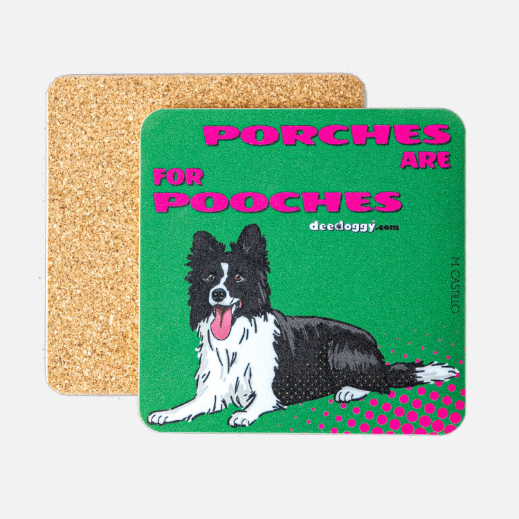 This Border Collie coaster is the perfect underdog: lays down and never whines under the feet of glasses. It doesn't mind the spills from mugs, glasses, bottles and pints in crafty kitchens, posh picnics, gargantuan garden parties, and boozy barbeques. The doggy design is vibrant like Spain, the home of dog artist, Maria Castillo. 10 cm x 10 cm x 5 mm and made from laminated cork and hardboard panels, manufactured and digitally printed in Britain. The base material of all our doggy gift coasters is an eco-friendly, renewable material derived from the bark of the cork oak tree and recycled paper. This Border Collie gift coaster is perfect for underpinning any beverage 'container', in front of the telly or on the terrace watching a doggy friend messing in the garden.