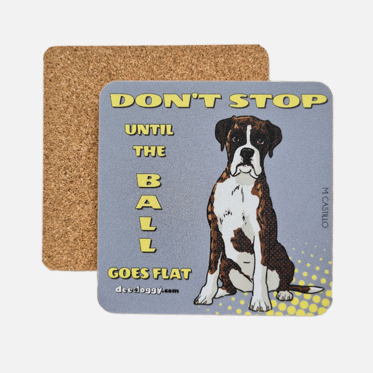 This Boxer coaster is the perfect underdog: lays down and never whines under the feet of glasses. It doesn't mind the spills from mugs, glasses, bottles and pints in crafty kitchens, posh picnics, gargantuan garden parties, and boozy barbeques. The doggy design is vibrant like Spain, the home of dog artist, Maria Castillo. 10 cm x 10 cm x 5 mm and made from laminated cork and hardboard panels, manufactured and digitally printed in Britain. The base material of all our doggy gift coasters is an eco-friendly, renewable material derived from the bark of the cork oak tree and recycled paper. This Boxer gift coaster is perfect for underpinning any beverage 'container', in front of the telly or on the terrace watching a doggy friend messing in the garden.