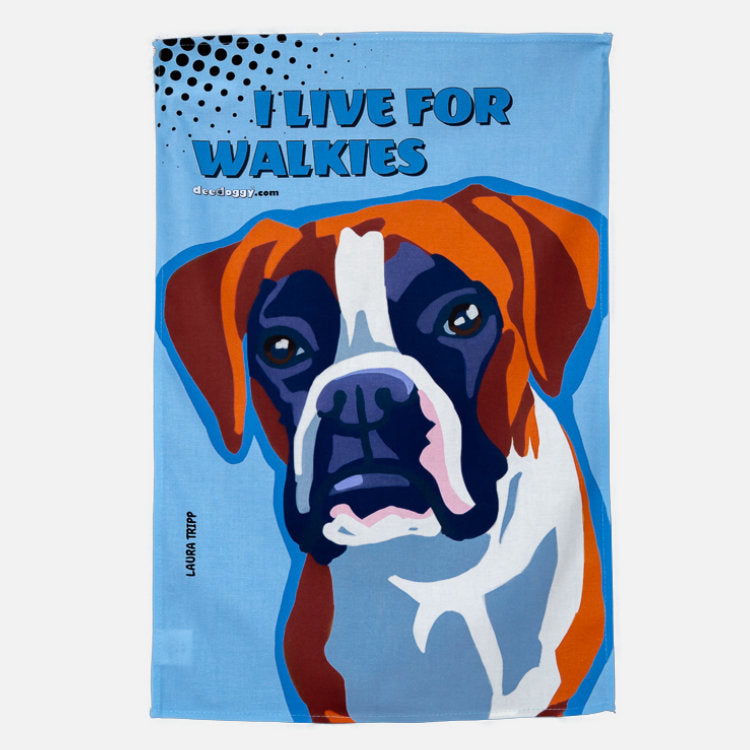 How many dogs can one fit in a kitchen? As many as you want: arty dog mugs, doggy coasters, and gift tea towels. They simply belong there. Crafty kitchens, posh picnics, gargantuan garden parties, and big American-style barbecues all will make good use of our Utah-based dog artist's Boxer tea towel creation.