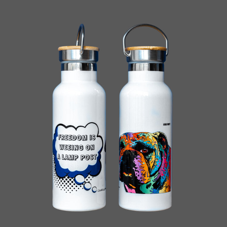 Our British Bulldog water bottle is your first line of defence against thirst and heat-stroke on a hot summer walk. Half a litre (1.06pints), made of stainless steel with a bamboo screw. Hand-wash and dry before first use. Always clean it with warm water and mild detergents to protect the clean steel inside and the fun dog art on the exterior. Avoid cleaning in a dishwasher, and do not use detergents that contain bleach or chlorine. Not suitable for fizzy, alcohol, and diary-based beverages.