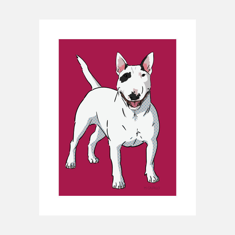 Bill Gates (who's a Shih Tzu and Poodle-mixes fan) wanted to have a personal computer on every desk. If we had our way, we would hang doggy art prints above all those desks to celebrate the unique bond between humans and man's best friend. Our Bull Terrier dog art is vibrant like Spain, the native home of our cosmopolitan dog artist, Maria Castillo.