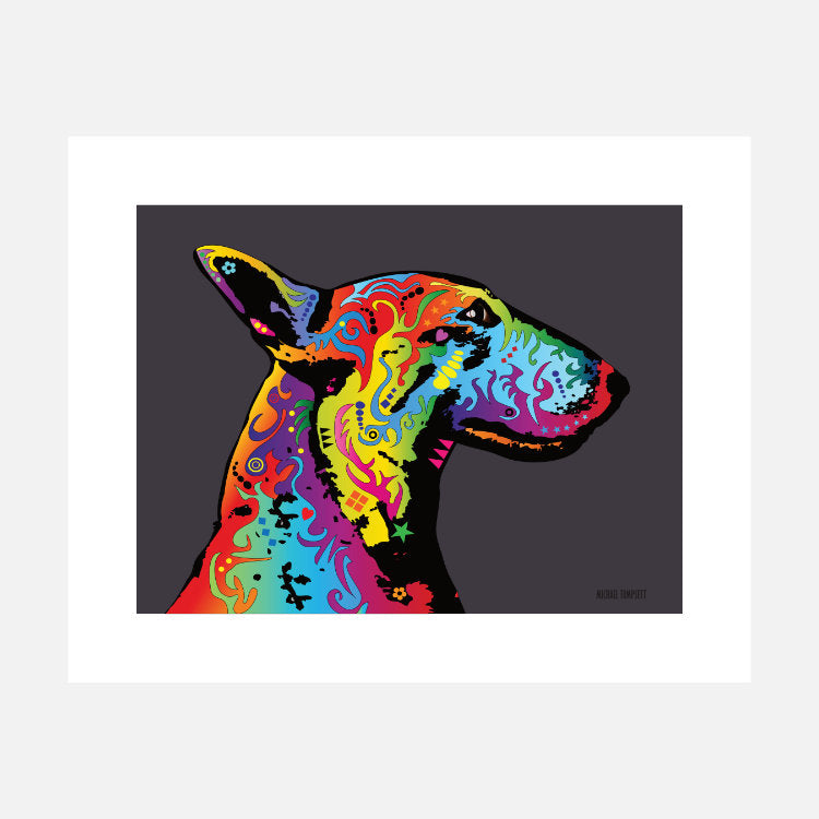 The UK is a global leader in the creative industries. The wide variety of British artists, architects, performers, TV and movie studios and advertising agencies contribute 120 billion pounds in new value each year, more creativity per capita than in any other country. This Bull Terrier dog art of Michael Tompsett is vibrant like the living-breathing art scene of the UK.