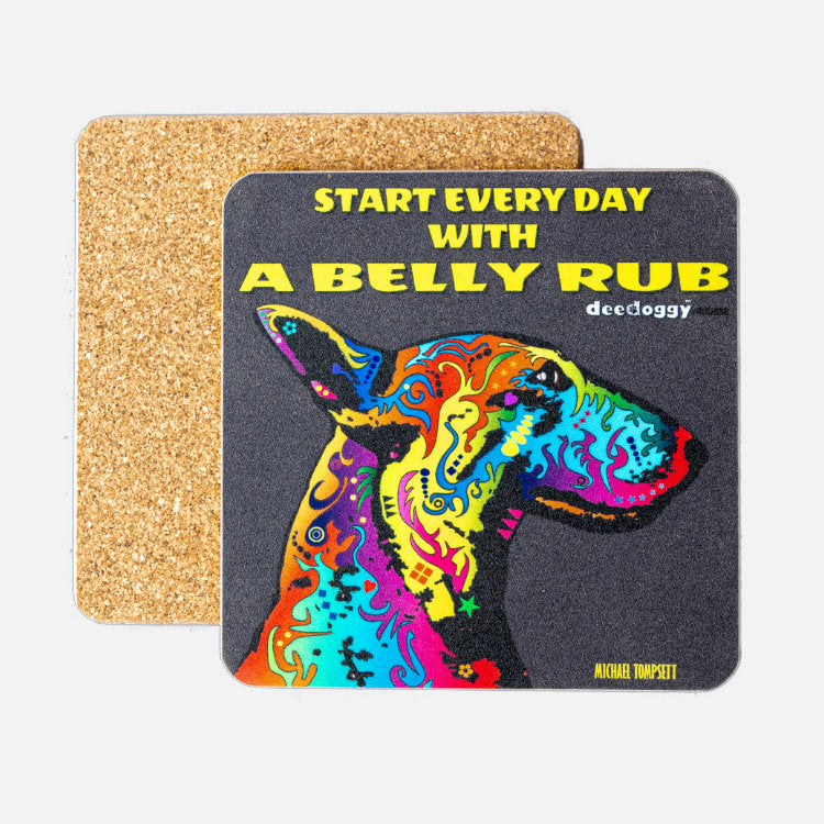 Our dog companions are colourful creatures. And colourful is this Bull Terrier art by Michael Tompsett. Any multi-coloured mug, ablaze amber ale, or ruby Burgundy in a stemmed glass will find their colour match in Michael's dog art coaster. 10 cm x 10 cm x 5 mm and made from laminated cork and hardboard panels, manufactured and digitally printed in Britain. The base material of all our doggy gift coasters is an eco-friendly, renewable material derived from the bark of the cork oak tree and recycled paper. This Bull Terrier gift coaster is perfect for underpinning any beverage 'container', in front of the telly or on the terrace watching a doggy friend messing in the garden.