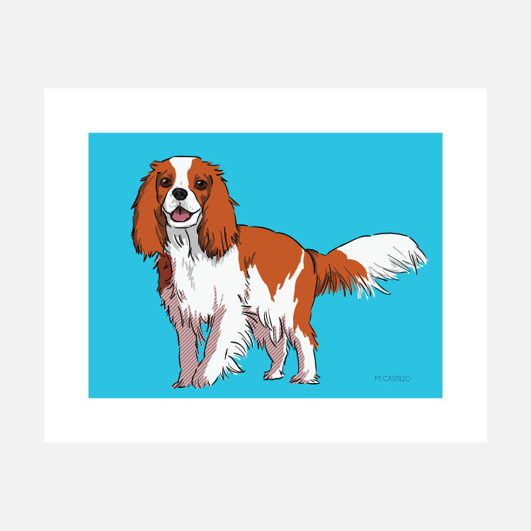 Bill Gates (who's a Shih Tzu and Poodle-mixes fan) wanted to have a personal computer on every desk. If we had our way, we would hang doggy art prints above all those desks to celebrate the unique bond between humans and man's best friend. That's why we put our hearts in our arts... and the other way around. And we put them on the wall... yes, above the desk with the computer. Our Cavalier King Charles Spaniel dog art is vibrant like Spain, the native home of our cosmopolitan dog artist, Maria Castillo.