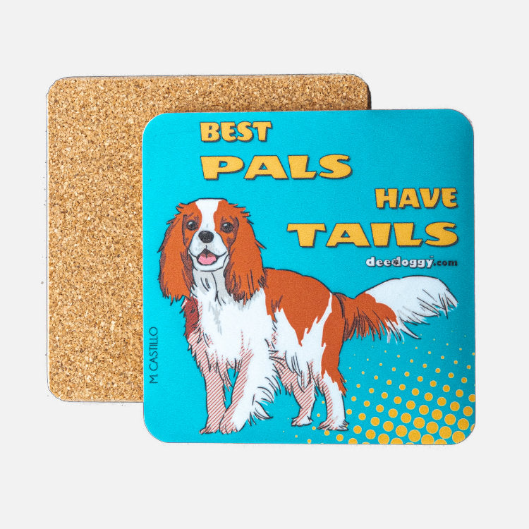 This Cavalier coaster is the perfect underdog: lays down and never whines under the feet of glasses. It doesn't mind the spills from mugs, glasses, bottles and pints in crafty kitchens, posh picnics, gargantuan garden parties, and boozy barbeques. The doggy design is vibrant like Spain, the home of dog artist, Maria Castillo. 10 cm x 10 cm x 5 mm and made from laminated cork and hardboard panels, manufactured and digitally printed in Britain. The base material of all our doggy gift coasters is an eco-friendly, renewable material derived from the bark of the cork oak tree and recycled paper. This Cavalier King Charles Spaniel gift coaster is perfect for underpinning any beverage 'container', in front of the telly or on the terrace watching a doggy friend messing in the garden.