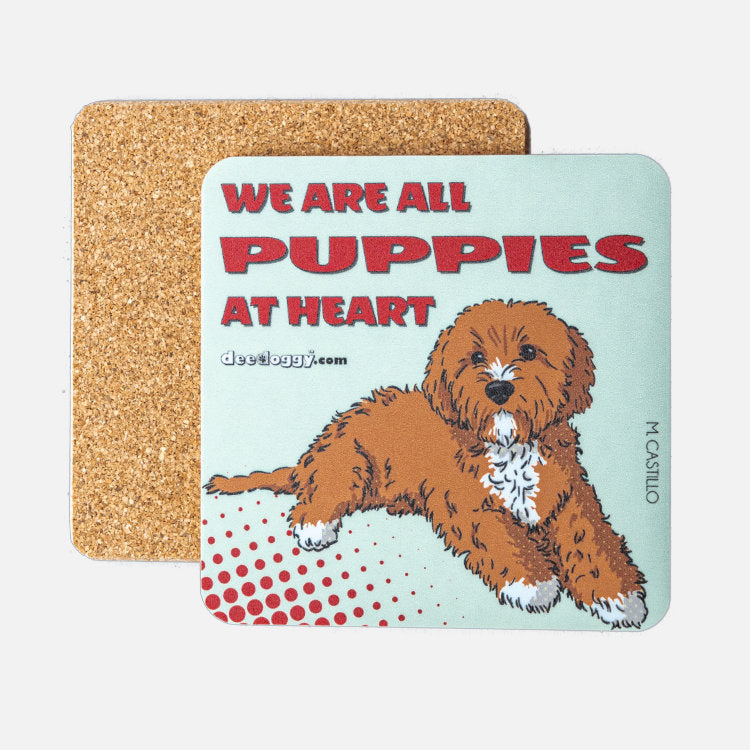 This Cavapoo coaster is the perfect underdog: lays down and never whines under the feet of glasses. It doesn't mind the spills from mugs, glasses, bottles and pints in crafty kitchens, posh picnics, gargantuan garden parties, and boozy barbeques. The doggy design is vibrant like Spain, the home of dog artist, Maria Castillo. 10 cm x 10 cm x 5 mm and made from laminated cork and hardboard panels, manufactured and digitally printed in Britain. The base material of all our doggy gift coasters is an eco-friendly, renewable material derived from the bark of the cork oak tree and recycled paper. This Cavapoo gift coaster is perfect for underpinning any beverage 'container', in front of the telly or on the terrace watching a doggy friend messing in the garden.