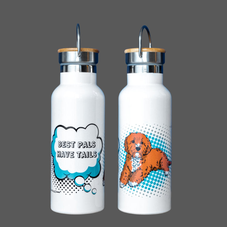 Our Cavapoo water bottle is your first line of defence against thirst and heat-stroke on a hot summer walk. Half a litre (1.06pints), made of stainless steel with a bamboo screw. Hand-wash and dry before first use. Always clean it with warm water and mild detergents to protect the clean steel inside and the fun dog art on the exterior. Avoid cleaning in a dishwasher, and do not use detergents that contain bleach or chlorine. Not suitable for fizzy, alcohol, and diary-based beverages.