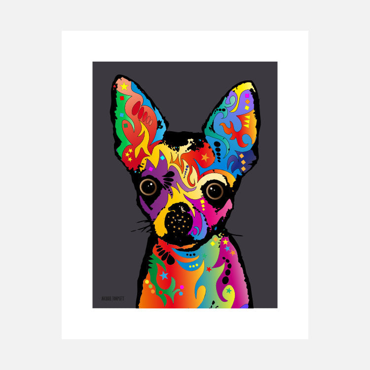 The UK is a global leader in the creative industries. The wide variety of British artists, architects, performers, TV and movie studios and advertising agencies contribute 120 billion pounds in new value each year, more creativity per capita than in any other country. This Chihuahua dog art of Michael Tompsett is vibrant like the living-breathing art scene of the UK.