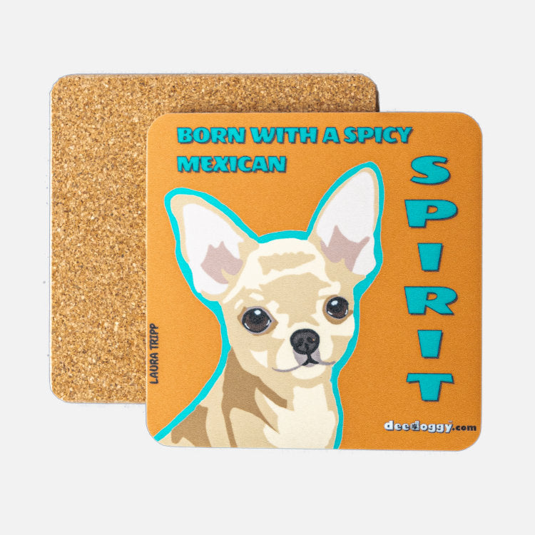 ”Dogs are man’s best friend”. Our Chihuahua coaster is the best friend of mugs, glasses, and bottles of cold and hot drinks and it is the perfect underdog: never whines about the spills, lays quietly and happy under the feet of glasses. The art of this doggy coaster is from Salt Lake City, Utaaahhh. And ”aaahhh! and wow!” are the most common reactions to the creations of our dog artist, Laura Tripp. 10 cm x 10 cm x 5 mm and made from laminated cork and hardboard panels, manufactured and digitally printed in Britain. The base material of all our doggy gift coasters is an eco-friendly, renewable material derived from the bark of the cork oak tree and recycled paper. This Chihuahua gift coaster is perfect for underpinning any beverage 'container', in front of the telly or on the terrace watching a doggy friend messing in the garden.