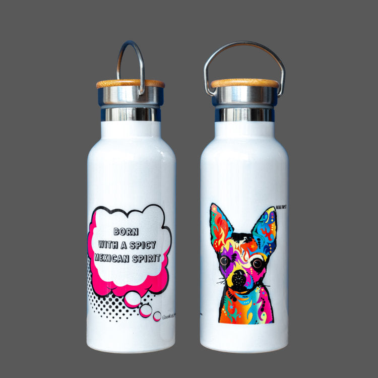 Our Chihuahua water bottle is your first line of defence against thirst and heat-stroke on a hot summer walk. Half a litre (1.06pints), made of stainless steel with a bamboo screw. Hand-wash and dry before first use. Always clean it with warm water and mild detergents to protect the clean steel inside and the fun dog art on the exterior. Avoid cleaning in a dishwasher, and do not use detergents that contain bleach or chlorine. Not suitable for fizzy, alcohol, and diary-based beverages.