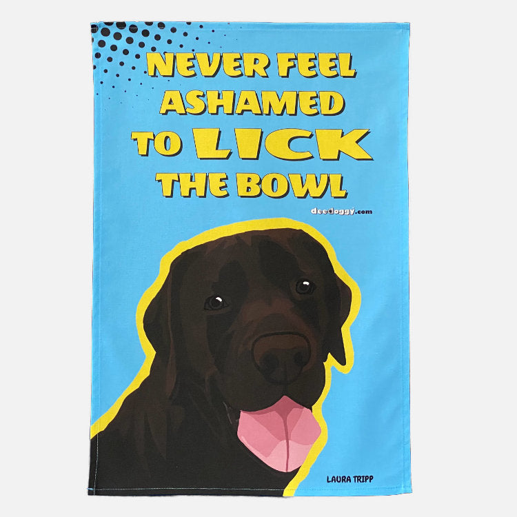 All are made of 230 grams per square meter of 100% cotton; our Labrador gift tea towels are printed using the latest generation digital pigment printers for more vibrant colours of our dog art. Printing, sewing and hemming take place in North West England. They are approximately 45x68cm (17 x 26 inches) in size, and a hanging loop and the washing instructions are on the back. This Choco Labrador tea towel is a valuable and eager companion around the house. It covers, protects, and serves up what needs a cover, protection, or serving up.
