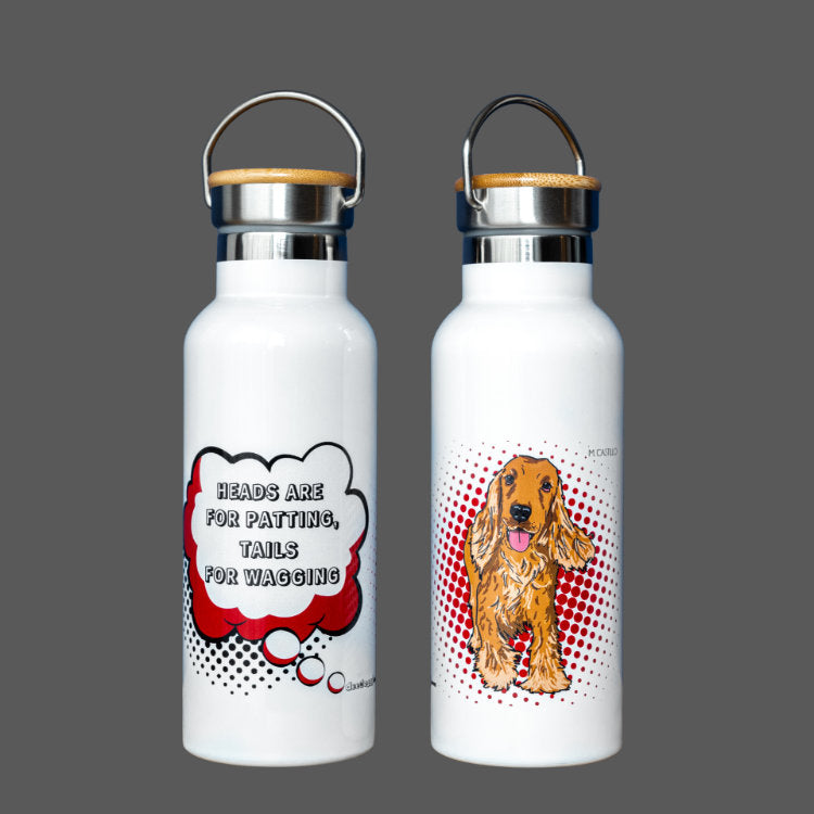Our Cocker Spaniel water bottle is your first line of defence against thirst and heat-stroke on a hot summer walk. Half a litre (1.06pints), made of stainless steel with a bamboo screw. Hand-wash and dry before first use. Always clean it with warm water and mild detergents to protect the clean steel inside and the fun dog art on the exterior. Avoid cleaning in a dishwasher, and do not use detergents that contain bleach or chlorine. Not suitable for fizzy, alcohol, and diary-based beverages.