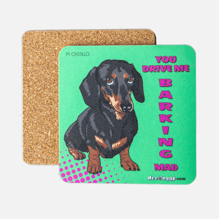 This Dachshund coaster is the perfect underdog: lays down and never whines under the feet of glasses. It doesn't mind the spills from mugs, glasses, bottles and pints in crafty kitchens, posh picnics, gargantuan garden parties, and boozy barbeques. The doggy design is vibrant like Spain, the home of dog artist, Maria Castillo. 10 cm x 10 cm x 5 mm and made from laminated cork and crystal surface hardboard panels, manufactured and digitally printed in Britain. The base material of all our doggy gift coasters is an eco-friendly, renewable material derived from the bark of the cork oak tree and recycled paper. This Dachshund gift coaster is perfect for underpinning any beverage 'container', in front of the telly or on the terrace watching a doggy friend messing in the garden.