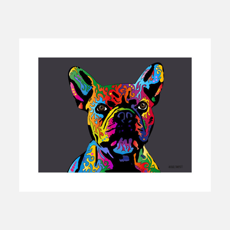 The UK is a global leader in the creative industries. The wide variety of British artists, architects, performers, TV and movie studios and advertising agencies contribute 120 billion pounds in new value each year, more creativity per capita than in any other country. This French Bulldog dog art of Michael Tompsett is vibrant like the living-breathing art scene of the UK.