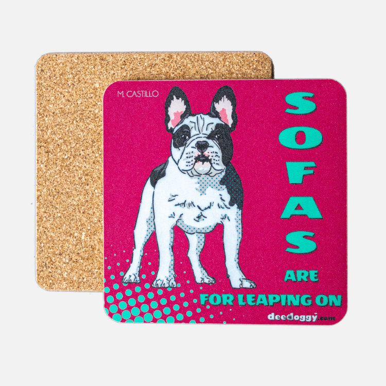 This French Bulldog coaster is the perfect underdog: lays down and never whines under the feet of glasses. It doesn't mind the spills from mugs, glasses, bottles and pints in crafty kitchens, posh picnics, gargantuan garden parties, and boozy barbeques. The doggy design is vibrant like Spain, the home of dog artist, Maria Castillo. 10 cm x 10 cm x 5 mm and made from laminated cork and hardboard panels, manufactured and digitally printed in Britain. The base material of all our doggy gift coasters is an eco-friendly, renewable material derived from the bark of the cork oak tree and recycled paper. This French Bulldog gift coaster is perfect for underpinning any beverage 'container', in front of the telly or on the terrace watching a doggy friend messing in the garden.