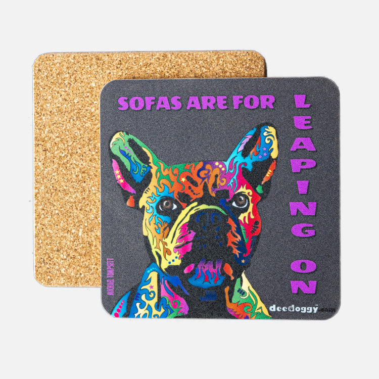 Our dog companions are colourful creatures. And colourful is this French Bulldog art by Michael Tompsett. Any multi-coloured mug, ablaze amber ale, or ruby Burgundy in a stemmed glass will find their colour match in Michael's dog art coaster. 10 cm x 10 cm x 5 mm and made from laminated cork and hardboard panels, manufactured and digitally printed in Britain. The base material of all our doggy gift coasters is an eco-friendly, renewable material derived from the bark of the cork oak tree and recycled paper. This French Bulldog gift coaster is perfect for underpinning any beverage 'container', in front of the telly or on the terrace watching a doggy friend messing in the garden.