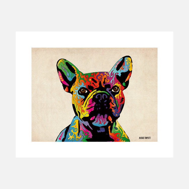The UK is a global leader in the creative industries. The wide variety of British artists, architects, performers, TV and movie studios and advertising agencies contribute 120 billion pounds in new value each year, more creativity per capita than in any other country. This French Bulldog dog art of Michael Tompsett is vibrant like the living-breathing art scene of the UK.