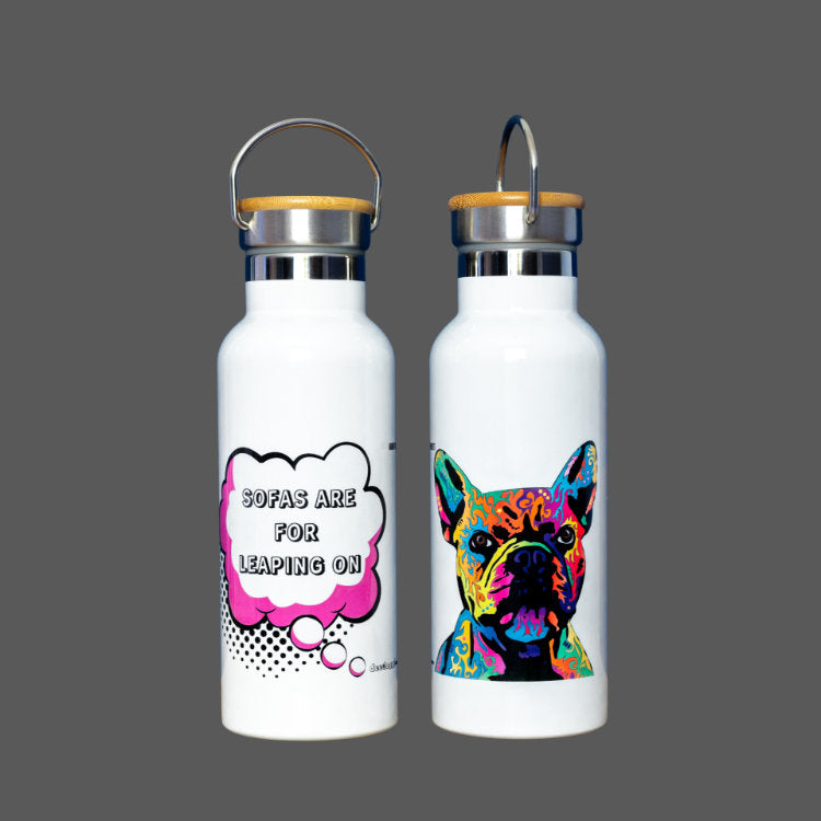 Our French Bulldog water bottle is your first line of defence against thirst and heat-stroke on a hot summer walk. Half a litre (1.06pints), made of stainless steel with a bamboo screw. Hand-wash and dry before first use. Always clean it with warm water and mild detergents to protect the clean steel inside and the fun dog art on the exterior. Avoid cleaning in a dishwasher, and do not use detergents that contain bleach or chlorine. Not suitable for fizzy, alcohol, and diary-based beverages.