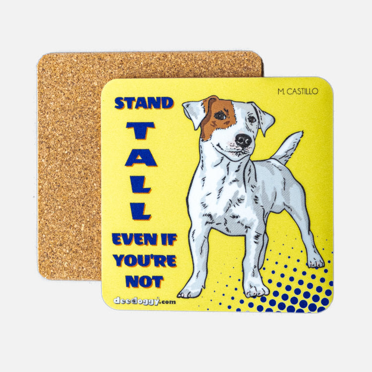 This Jack Russell coaster is the perfect underdog: lays down and never whines under the feet of glasses. It doesn't mind the spills from mugs, glasses, bottles and pints in crafty kitchens, posh picnics, gargantuan garden parties, and boozy barbeques. The doggy design is vibrant like Spain, the home of dog artist, Maria Castillo. 10 cm x 10 cm x 5 mm and made from laminated cork and hardboard panels, manufactured and digitally printed in Britain. The base material of all our doggy gift coasters is an eco-friendly, renewable material derived from the bark of the cork oak tree and recycled paper. This Jack Russell gift coaster is perfect for underpinning any beverage 'container', in front of the telly or on the terrace watching a doggy friend messing in the garden.