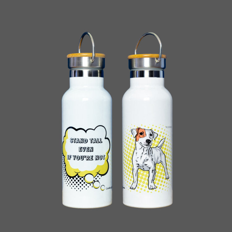 Our Jack Russell water bottle is your first line of defence against thirst and heat-stroke on a hot summer walk. Half a litre (1.06pints), made of stainless steel with a bamboo screw. Hand-wash and dry before first use. Always clean it with warm water and mild detergents to protect the clean steel inside and the fun dog art on the exterior. Avoid cleaning in a dishwasher, and do not use detergents that contain bleach or chlorine. Not suitable for fizzy, alcohol, and diary-based beverages.