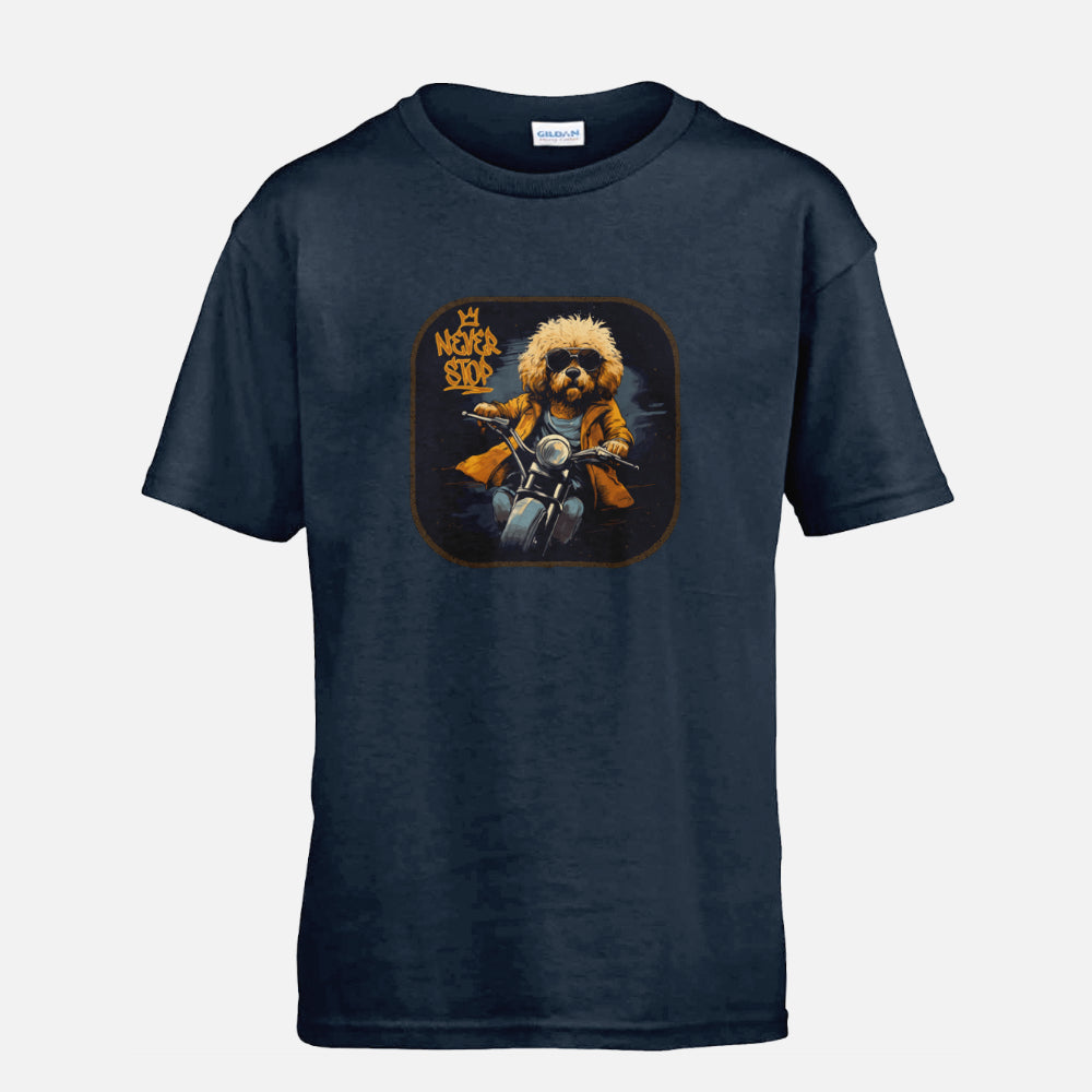 🐶🏍️ Gear up for adventure with our "Never Stop" Labradoodle Kids' Tee! It's a rally cry for the young and the fearless, the little ones with dreams as big and fluffy as a Labradoodle's coat. It's a wearable tale of fun, freedom, and the wind in their fur – er, hair!
