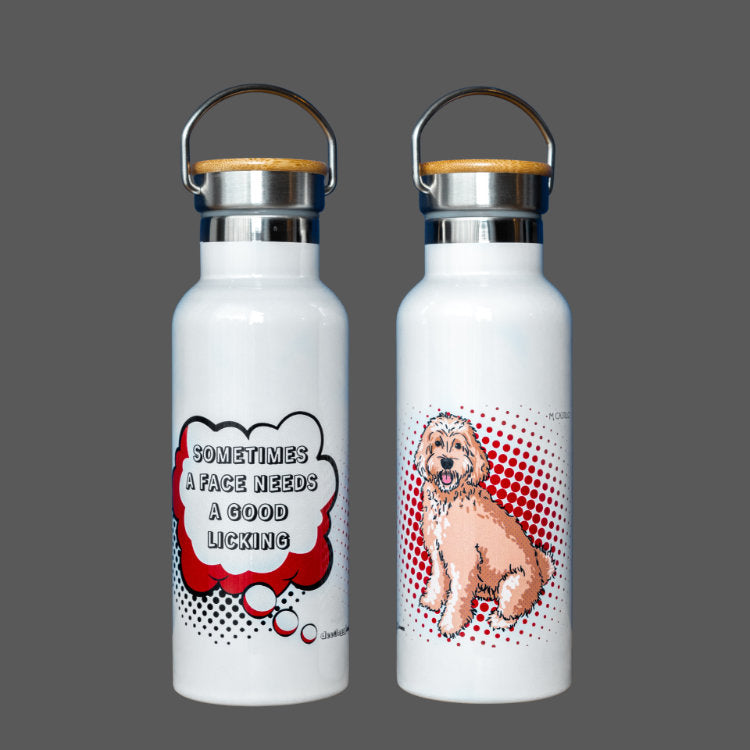 Our Labradoodle water bottle is your first line of defence against thirst and heat-stroke on a hot summer walk. Half a litre (1.06 pints), made of stainless steel with a bamboo screw. Hand-wash and dry before first use. Always clean it with warm water and mild detergents to protect the clean steel inside and the fun dog art on the exterior. Avoid cleaning in a dishwasher, and do not use detergents that contain bleach or chlorine. Not suitable for fizzy, alcohol, and diary-based beverages.