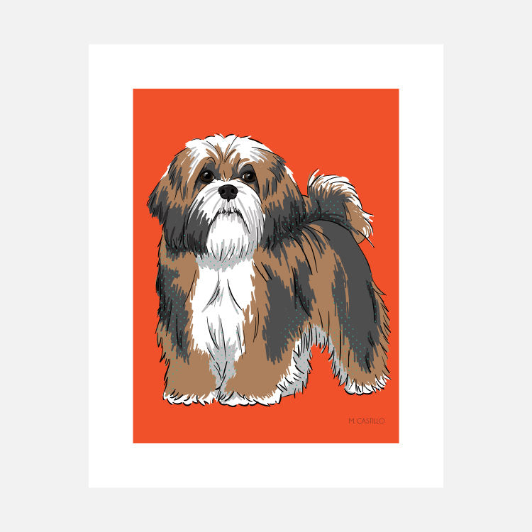 Bill Gates (a Shih Tzu and Poodle-mixes fan) wanted a personal computer on every desk. If we had our way, we would hang doggy art prints above all those desks to celebrate the unique bond between humans and man's best friend. Our Lhasa Apso dog art is vibrant like Spain, the native home of our cosmopolitan dog artist, Maria Castillo.