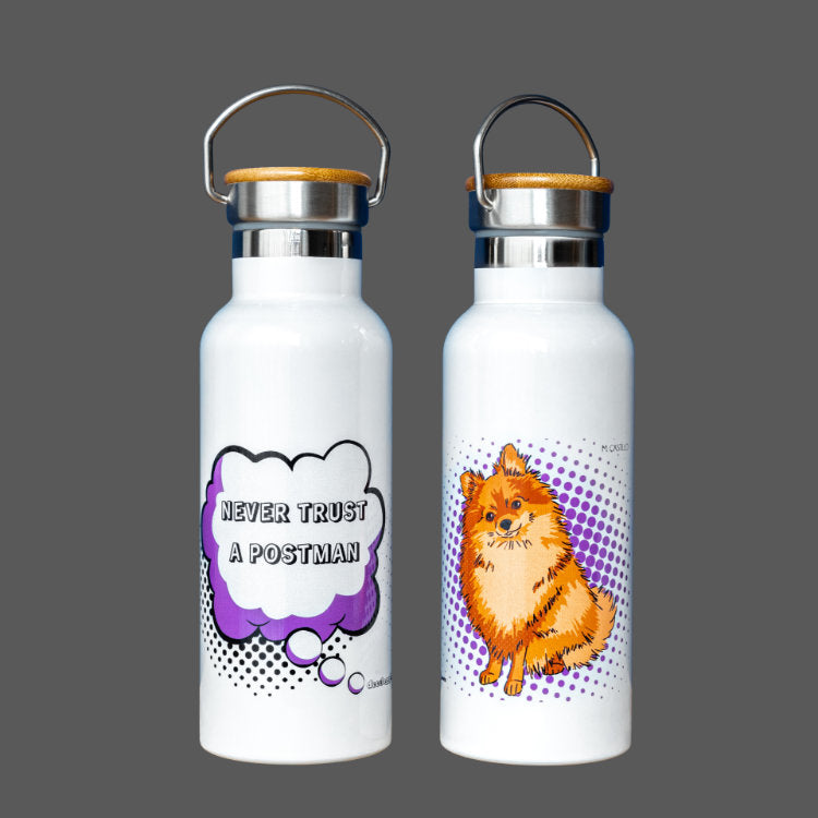Our Pomeranian water bottle is your first line of defence against thirst and heat-stroke on a hot summer walk. Half a litre (1.06 pints), made of stainless steel with a bamboo screw. Hand-wash and dry before first use. Always clean it with warm water and mild detergents to protect the clean steel inside and the fun dog art on the exterior. Avoid cleaning in a dishwasher, and do not use detergents that contain bleach or chlorine. Not suitable for fizzy, alcohol, and diary-based beverages.