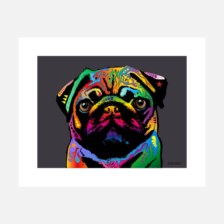 The UK is a global leader in the creative industries. The wide variety of British artists, architects, performers, TV and movie studios and advertising agencies contribute 120 billion pounds in new value each year, more creativity per capita than in any other country. This Pug dog art of Michael Tompsett is vibrant like the living-breathing art scene of the UK.