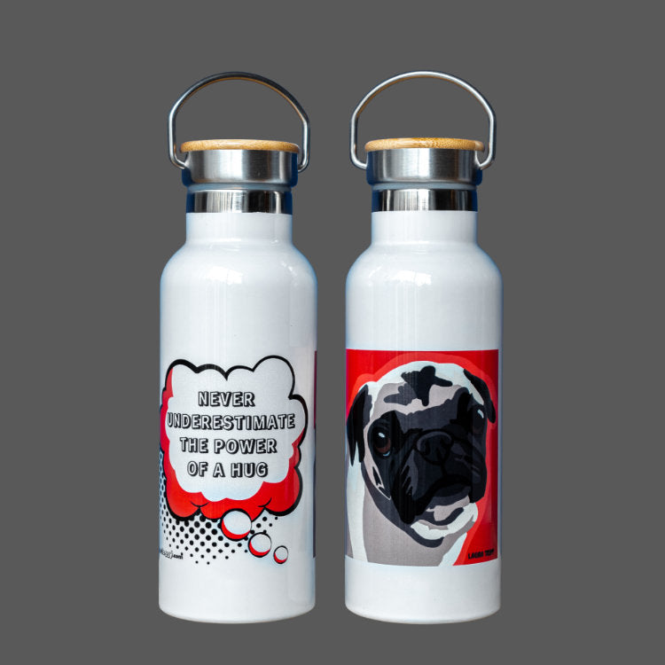 Our Pug water bottle is your first line of defence against thirst and heat-stroke on a hot summer walk. Half a litre (1.06 pints), made of stainless steel with a bamboo screw cap. Hand-wash and dry before first use. Always clean it with warm water and mild detergents to protect the clean steel inside and the fun dog art on the exterior. Avoid cleaning in a dishwasher, and do not use detergents that contain bleach or chlorine. Not suitable for fizzy, alcohol, and diary-based beverages.