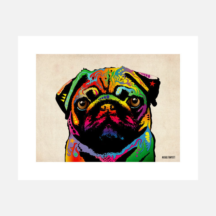 The UK is a global leader in the creative industries. The wide variety of British artists, architects, performers, TV and movie studios and advertising agencies contribute 120 billion pounds in new value each year, more creativity per capita than in any other country. This Pug dog art of Michael Tompsett is vibrant like the living-breathing art scene of the UK.