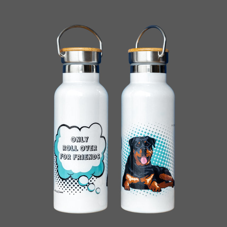 Our Rottweiler water bottle is your first line of defence against thirst and heat-stroke on a hot summer walk. Half a litre (1.06 pints), made of stainless steel with a bamboo screw cap. Hand-wash and dry before first use. Always clean it with warm water and mild detergents to protect the clean steel inside and the fun dog art on the exterior. Avoid cleaning in a dishwasher, and do not use detergents that contain bleach or chlorine. Not suitable for fizzy, alcohol, and diary-based beverages.