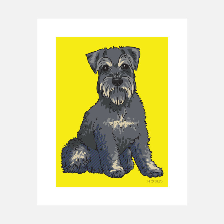 Bill Gates (a Shih Tzu and Poodle-mixes fan) wanted a personal computer on every desk. If we had our way, we would hang doggy art prints above all those desks to celebrate the unique bond between humans and man's best friend. Our Schnauzer dog art is vibrant like Spain, the native home of our cosmopolitan dog artist, Maria Castillo.
