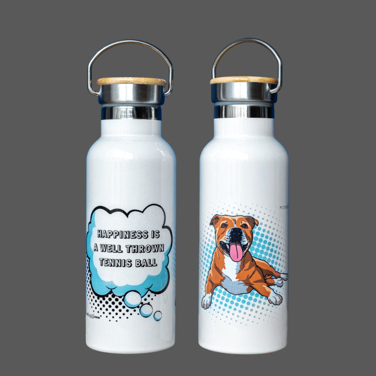 Our Staffordshire Terrier water bottle is your first line of defence against thirst and heat-stroke on a hot summer walk. Half a litre (1.06 pints), made of stainless steel with a bamboo screw cap. Hand-wash and dry before first use. Always clean it with warm water and mild detergents to protect the clean steel inside and the fun dog art on the exterior. Avoid cleaning in a dishwasher, and do not use detergents that contain bleach or chlorine. Not suitable for fizzy, alcohol, and diary-based beverages.