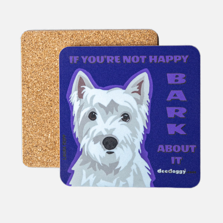 ”Dogs are man’s best friend”. Our West Highland Terrier coaster is the best friend of mugs, glasses, and bottles of cold and hot drinks and it is the perfect underdog: never whines about the spills, lays quietly and happy under the feet of glasses. The art of this doggy coaster is from Salt Lake City, Utaaahhh. And ”aaahhh! and wow!” are the most common reactions to the creations of our dog artist, Laura Tripp. 10 cm x 10 cm x 5 mm and made from laminated cork and hardboard panels, manufactured and digitally printed in Britain. The base material of all our doggy gift coasters is an eco-friendly, renewable material derived from the bark of the cork oak tree and recycled paper. This West Highland Terrier gift coaster is perfect for underpinning any beverage 'container', in front of the telly or on the terrace watching a doggy friend messing in the garden.