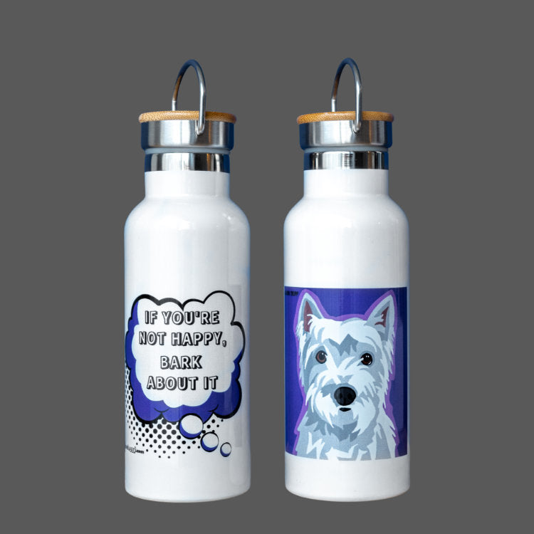 Our West Highland Terrier water bottle is your first line of defence against thirst and heat-stroke on a hot summer walk. Half a litre (1.06 pints), made of stainless steel with a bamboo screw cap. Hand-wash and dry before first use. Always clean it with warm water and mild detergents to protect the clean steel inside and the fun dog art on the exterior. Avoid cleaning in a dishwasher, and do not use detergents that contain bleach or chlorine. Not suitable for fizzy, alcohol, and diary-based beverages.