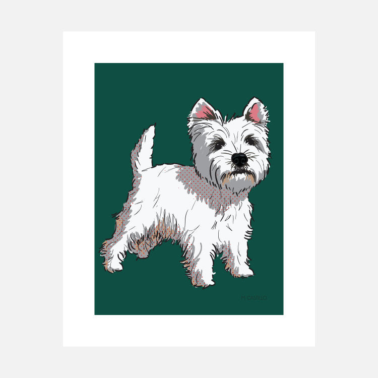 Bill Gates (who's a Shih Tzu and Poodle-mixes fan) wanted to have a personal computer on every desk. If we had our way, we would hang doggy art prints above all those desks to celebrate the unique bond between humans and man's best friend. Our Westie dog art is vibrant like Spain, the native home of our cosmopolitan dog artist, Maria Castillo.