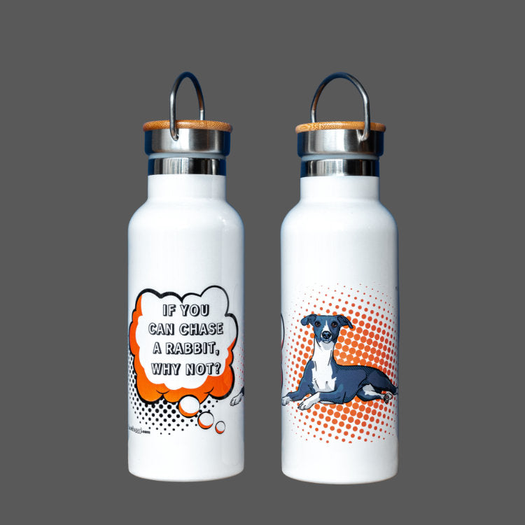 Our Whippet water bottle is your first line of defence against thirst and heat-stroke on a hot summer walk. Half a litre (1.06 pints), made of stainless steel with a bamboo screw cap. Hand-wash and dry before first use. Always clean it with warm water and mild detergents to protect the clean steel inside and the fun dog art on the exterior. Avoid cleaning in a dishwasher, and do not use detergents that contain bleach or chlorine. Not suitable for fizzy, alcohol, and diary-based beverages.