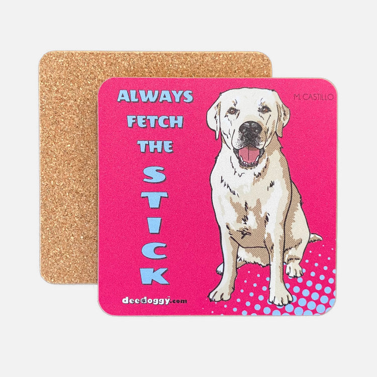 This Yellow Labrador coaster is the perfect underdog: lays down and never whines under the feet of glasses. It doesn't mind the spills from mugs, glasses, bottles and pints in crafty kitchens, posh picnics, gargantuan garden parties, and boozy barbeques. The doggy design is vibrant like Spain, the home of dog artist, Maria Castillo. 10 cm x 10 cm x 5 mm and made from laminated cork and hardboard panels, manufactured and digitally printed in Britain. The base material of all our doggy gift coasters is an eco-friendly, renewable material derived from the bark of the cork oak tree and recycled paper. This Yellow Labrador gift coaster is perfect for underpinning any beverage 'container', in front of the telly or on the terrace watching a doggy friend messing in the garden.