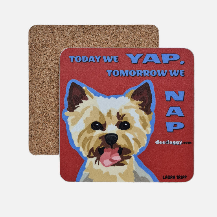 ”Dogs are man’s best friend”. Our Yorkshire Terrier coaster is the best friend of mugs, glasses, and bottles of cold and hot drinks and it is the perfect underdog: never whines about the spills, lays quietly and happy under the feet of glasses. The art of this doggy coaster is from Salt Lake City, Utaaahhh. And ”aaahhh! and wow!” are the most common reactions to the creations of our dog artist, Laura Tripp. 10 cm x 10 cm x 5 mm and made from laminated cork and hardboard panels, manufactured and digitally printed in Britain. The base material of all our doggy gift coasters is an eco-friendly, renewable material derived from the bark of the cork oak tree and recycled paper. This Yorkie gift coaster is perfect for underpinning any beverage 'container', in front of the telly or on the terrace watching a doggy friend messing in the garden.